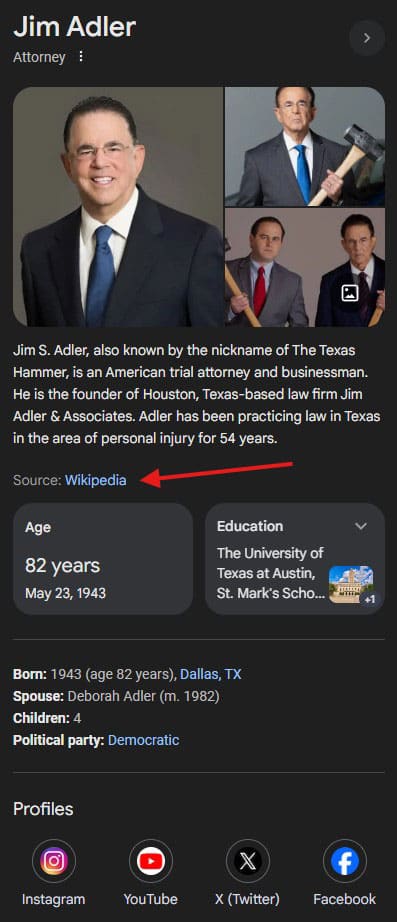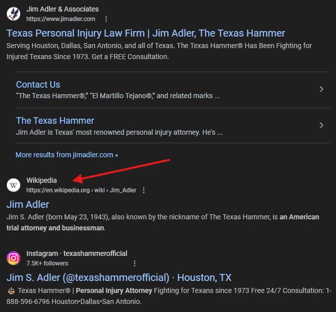 In the example above, Jim Adler’s Knowledge Panel references Wikipedia, which strengthens the connection between his brand, his nickname “The Texas Hammer,” and his law firm.
